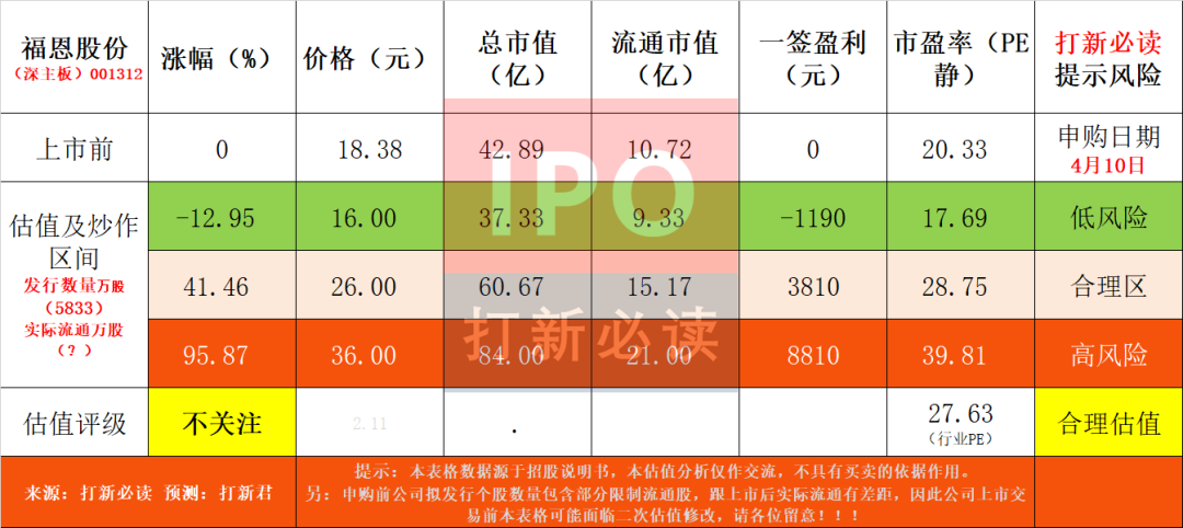 【提示说明】:本表格数据源于招股说明书,申购前公司拟发行个股数量包含部分限制流通股,跟上市后实际流通有差距,因此公司上市交易前本表格可能面临二次估值修改,请各位留意!!!$福恩股份(SZ001312)$