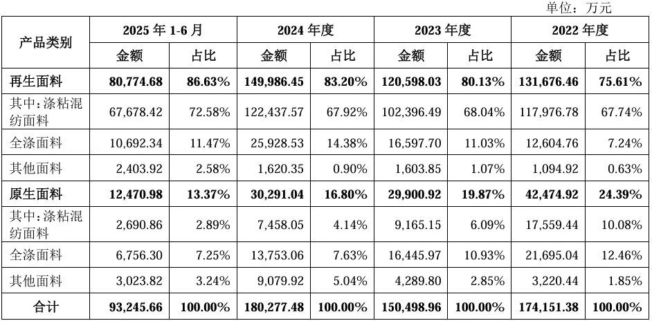 2025H1,公司主营业务收入按产品类别可分为两大板块,分别为再生面料(8.08亿元,占2025H1主营收入的86.63%)、原生面料(1.25亿元,2025H1主营收入的13.37%)。2022年至2025H1,再生面料始终为公司主要收入来源、收入占比稳定在75%以上;其中又以涤粘混纺面料为主体、为公司稳定贡献超65%的主营收入。