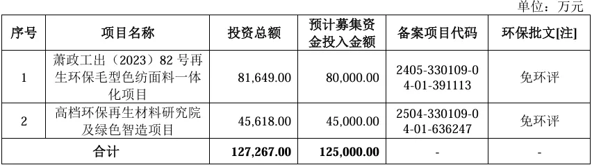 项目总投资资金12.5亿,其中8亿用于萧政工出(2023)82号再 生环保毛型色纺面料一体 化项目,4.5亿用于高档环保再生材料研究院 及绿色智造项目,具体项目如下: