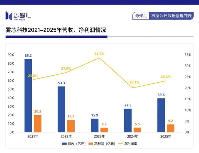 特别是在国内电子烟行业基本监管开始实施后,雾芯科技花了两年多时间,通过建立海外市场运营体系,完成业务重心转移,让净利润重回增长趋势。2025年,雾芯科技实现净利润9.22亿元,同比增长约67%,净利润率达到23.3%。