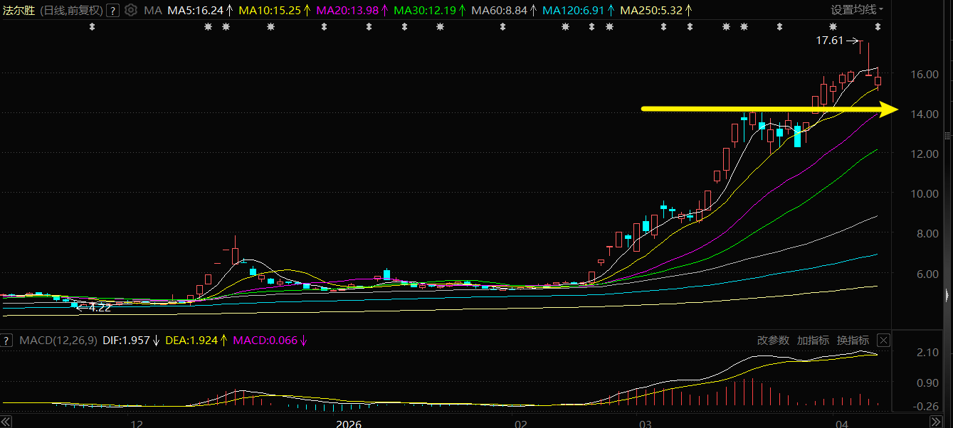 这样的个股大多是资金和热度推崇上冲,目前资金和热度尚可,17.61历史高位有些难攻破,抛压强,13.2附近为关键支撑区域要是这个位置守不住,就要变化自身的节奏,短期涨幅已经比较充分了