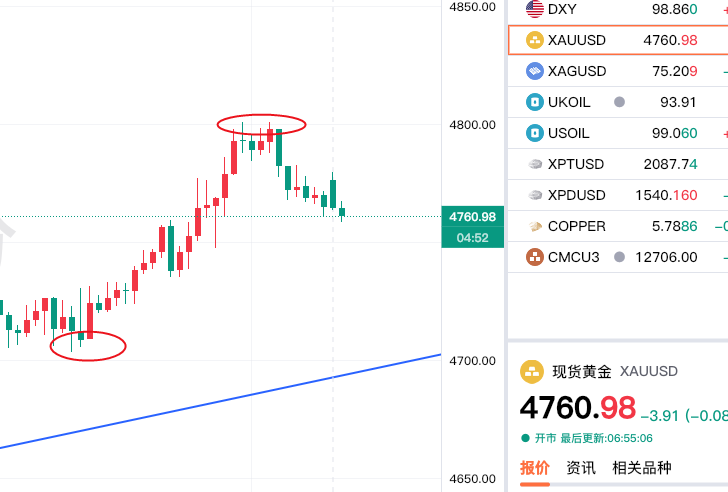 大黄,先说一下外盘,夜间再次上冲4800,还是没有站稳,而且 高点下移了,所以今日还是看好回落,关注下方4700-4710即可;