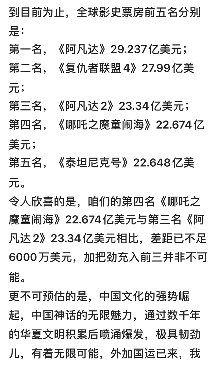 $光线传媒(SZ300251)$ 光线传媒能否崛起成中国版迪士尼?援引2026年4月8日BoxOfficeMojo最新数据显示,来自光线传媒的中国动漫电影《哪吒之魔童闹海》(大众俗称《哪吒2》)通过增加票房累计加持,它的全球票房已达达22.674亿美元,以微弱优势反超中国观众熟知的美剧经典《泰坦尼克号》(22.648亿美元),强势跻身全球影史票房第4位。令人欣喜的是,咱们的第四名《哪吒之魔童闹海》22.674亿美元与第三名《阿凡达2》23.34亿美元相比,差距已不足6000万美元,加把劲冲入前三指日可待!它不仅是中国电影更是亚洲电影首次闯入全球票房前五,慢慢在打破好莱坞长达百年对文化娱乐类产品——电影的垄断。这是中国文化自信、文化输出、电影出海、动漫产业走强的重要时刻和重大历史事件。跟草根导演饺子一样, 张雪机车的成功振奋人心,给到了普通人创业信心,联想到最近的热门电影《飞驰人生3》,张雪机车的成功故事简直就是现在真实版的飞驰机车!如果续拍《飞驰人生4》的话,不如直接套用张雪机车的故事!热点炸裂,故事现成,只要稍做改编、润色,依托《飞驰人生》系列的成熟有较的拍摄经验,学习《镖人》换人重拍赶拍的狠劲,加班加点,低成本高收益的张雪机车版的《飞驰人生4》在年底赶制完成并在春节档期跟观众见面也并非难事!影片中可邀请张雪做特别客串或片尾附加访谈彩蛋,必将票房暴涨!光线传媒自《哪吒2》票房暴挣以后,推出电影工业大作《东极岛》,制作精良,气势磅礴,本可望在暑期档再创辉煌,可恨被黑失利,之后国庆档的《三国的星空》虽然很有特色可惜没能火上,之后为求稳健发展,对《飞驰人生3》、《惊蛰无声》等的春节档电影的投资占比比较少,但如果有意投资拍摄张雪机车版的《飞驰人生4》的话应该抓住机会加大投资占比,争取更多的收益。《哪吒2》喊出的是“我命由我不由天!”主打逆天改命抗争反霸权。《东极岛》喊出“不能跪!跪久了就站不起来了!”呼吁反抗反压迫救死扶伤。“飞驰人生之张雪机车”主张草根创业为国争光,中国制造赶超世界!中国将迎来文化产业强势崛起,中国神话的无限魅力,通过数千年的华夏文明积累后喷涌爆发,极具韧劲,有着无限可能,外加国运已来,我们的闭环制造业加持,人才积累,安全和谐的国内大环境等等,光线传媒有望扛起文旅游商综合融汇并凸起的大旗,把中国文化产业带上新赛道,登上新高度。