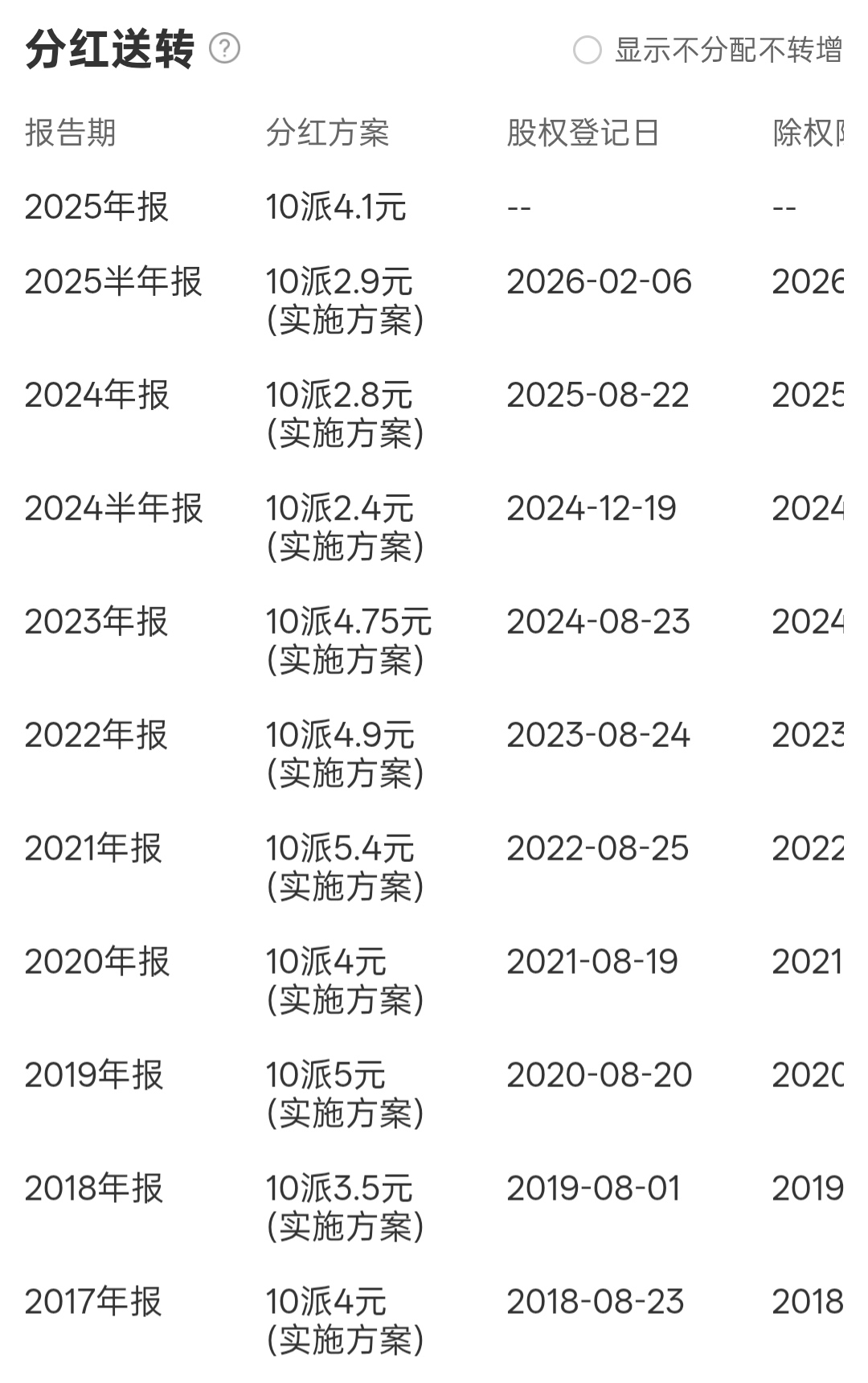 - 分红政策优厚,连续24年现金分红,2025年每股分红达7.00元。