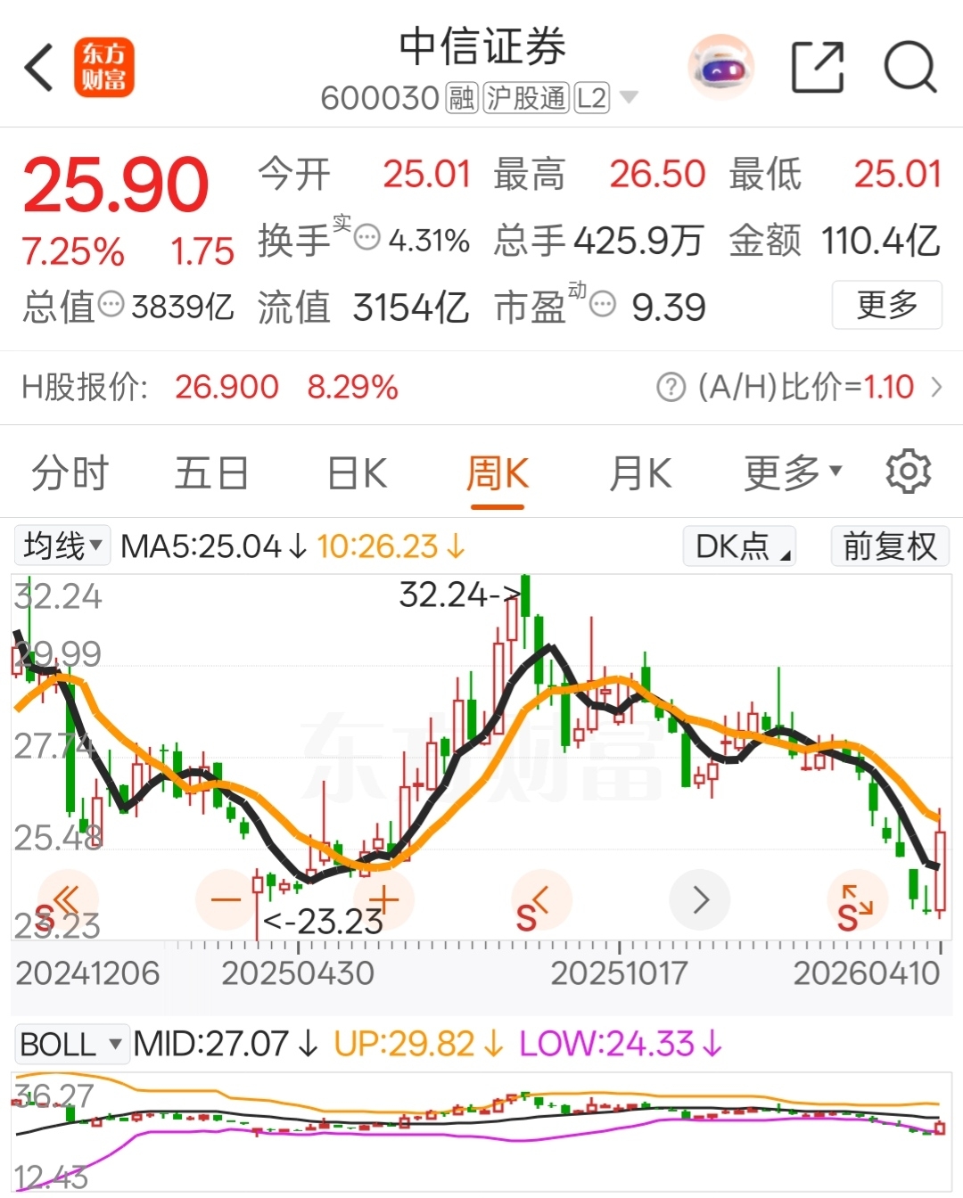 4、近期整体走势总结:近期中信证券股价呈现“超跌企稳,底部信号显现”的特征。从2026年1月初开始的长达3个月阴跌通道,到4月7日触及23.77元低点后,4月8日放量上涨1.94%,4月10日更是大幅拉升7.25%,形成了较为明确的底部反转信号。目前股价站在5日和10日均线之上,但仍受到20日均线压制,需关注能否有效突破该位置。