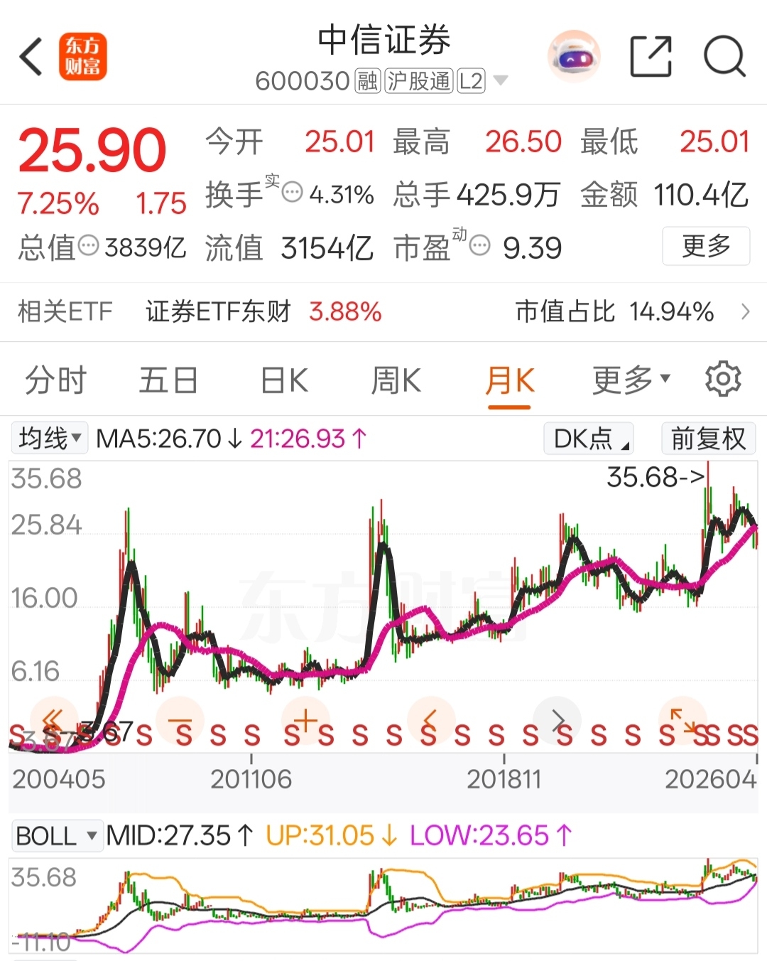 2025年第三季度末,中信证券普通股股东总数为669,445户。从历史数据看,股东人数呈现“涨时减少,跌时增加”的特征,反映出筹码在上涨行情中向机构集中,在下跌行情中向散户分散的规律。2026年4月以来,随着股价企稳回升,股东人数可能开始减少,筹码集中度逐步提高,这通常是股价上涨的先行指标之一。