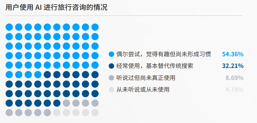 调研显示,超过 86% 的用户已经尝试过通过 AI 咨询旅行计划。这个数字意味着,AI 已经不再是少数人的新鲜玩具,而是真正走进了普通人的旅行决策流程。不过现在的用户大多还处在探索阶段,54.36% 的人只是偶尔尝试,觉得有趣但没形成习惯。真正把 AI 基本替代传统搜索的,占 32.21%。还有不到 14% 的人,要么听说过没用过,要么根本没听说过。