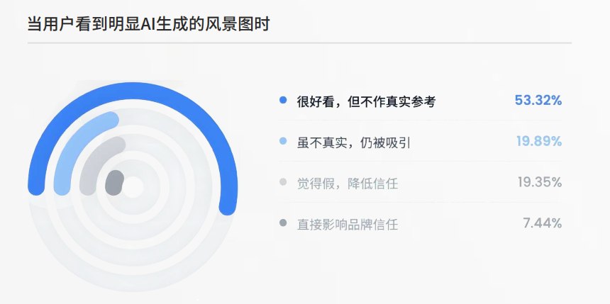 AI 生成的风景图虽然好看,但 53.32% 的用户明确表示,只会觉得好看,不会当作真实参考。19.35% 的人虽然觉得不真实,但还是会被吸引。只有不到三成的人会因为 AI 风景图影响对品牌的判断。真实摄影依然是最能激发旅行欲望的内容,毕竟用户最终追求的是真实的体验。