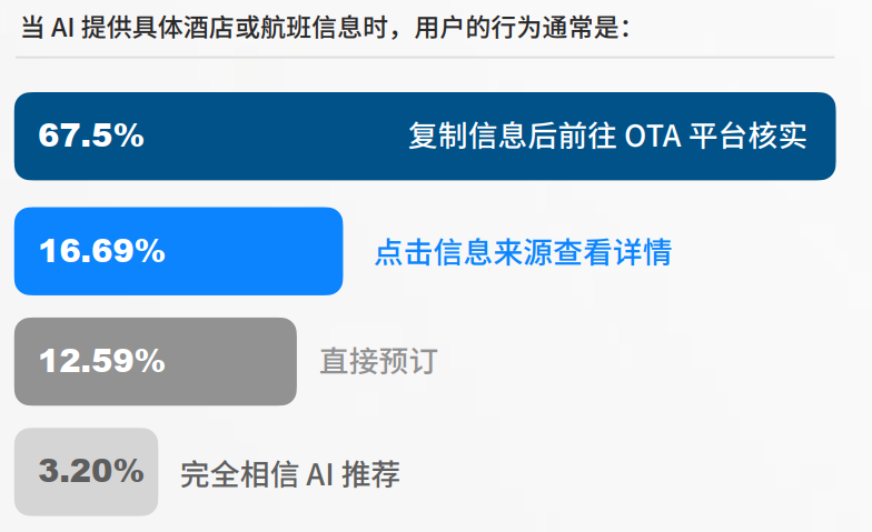 很多人担心 AI 会直接取代 OTA 成为交易入口,但数据显示这种情况还远没有发生。当 AI 给出具体的酒店或者航班信息时,67.5% 的用户会复制这些信息,然后去 OTA 平台核实价格和库存。16.69% 的人会点击信息来源查看详情,12.59% 的人会直接预订。只有 3.2% 的用户会完全相信 AI 的推荐。AI 现在更像是旅行规划的第一参考,而不是最终的交易平台。用户需要的实时价格库存和真实评价,这些能力目前还是牢牢掌握在 OTA 手里。