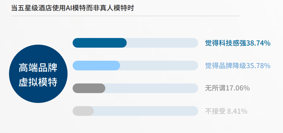 高端品牌用 AI 的风险比很多人想象的要大。当五星级酒店使用 AI 而不是真人时,38.74% 的用户觉得有科技感,35.78% 的用户觉得品牌降级了。还有 8.41% 的用户完全不接受。加起来有 44.2% 的用户持负面态度。这说明在高端品牌的传播中,AI 可能会削弱品牌的人文和奢华感。