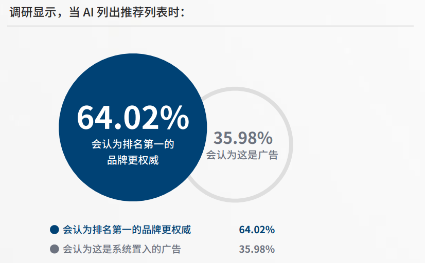 不过 AI 的排序已经形成了新的信任背书机制。当 AI 列出一份推荐清单时,64.02% 的用户会觉得排名第一的品牌更权威。只有 35.98% 的人会怀疑这是广告。超过六成的用户对 AI 推荐的首位品牌有默认信任。这意味着,谁能排在 AI 推荐的第一位,谁就获得了新的流量入口。