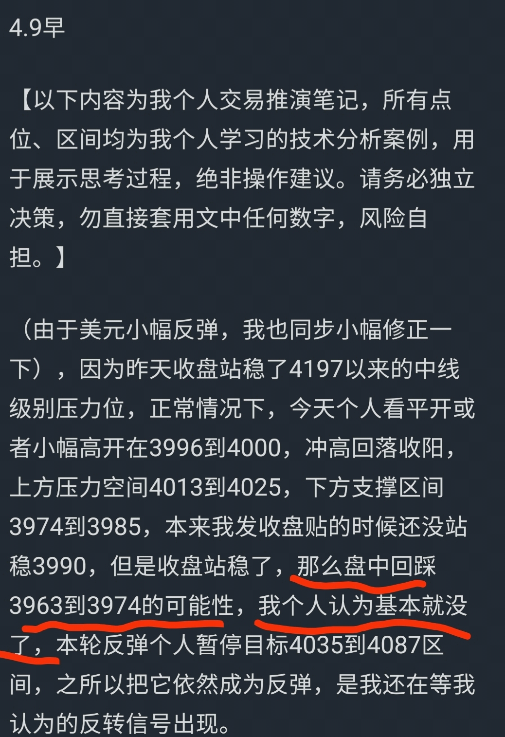 对于今天,这个预判是很难写的,但我还是主观性结合客观事实先写一个,个人认为明天因为消息面低开在3963到3974区间,差不多10到20个点,探底回升收阳,也可能是一个假阳,更大概率是继续维持震荡中枢震荡走势,上方压力区间我个人认为3974到3985,下方支撑区间3953到3963。今天会低开会回踩,但我认为空间并不会大,所以如果真的回踩幅度大一点,我会执行把上周做的减仓部分进行日内低买高卖操作。