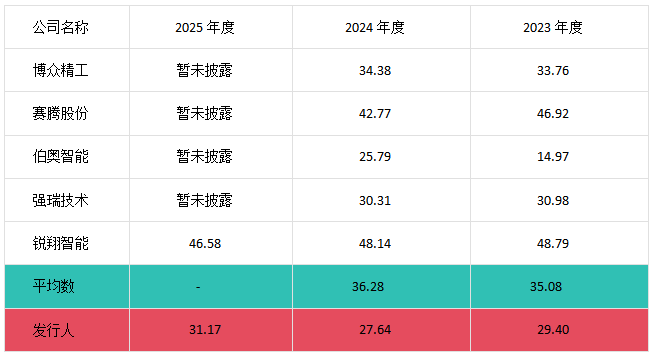 锐翔智能(874580)三年毛利率比例超46%(2023年48.79%、2024年48.14%、2025年46.58%),毛利率显著高于发行人;伯奥智能(300836)毛利率从14.97%升至25.79%增长明显,赛腾股份(603283)、强瑞技术(301128)、博众精工(688097)毛利率则呈波动或下降。