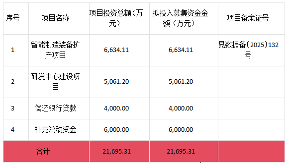 其中仅“智能制造装备扩产项目”已取得昆数据备案证,其余项目暂未列明备案信息。