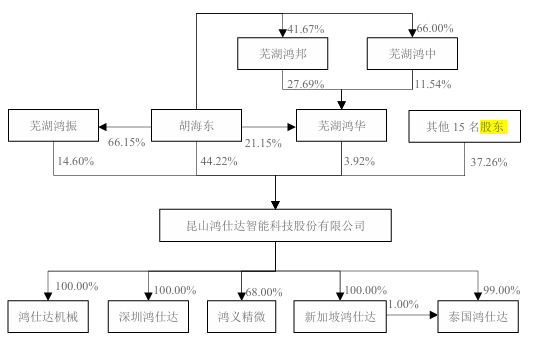 昆山鸿仕达智能科技股份有限公司由芜湖鸿振(66.15%)、胡海东(44.22%)、芜湖鸿华(21.15%)、其他15名股东(37.26%)持股。