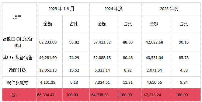 产品结构呈现多元化。智能自动化设备(线)为核心业务,占比始终维持在90%以上,其中装备销售为主要收入来源,但占比呈缓慢下降趋势;