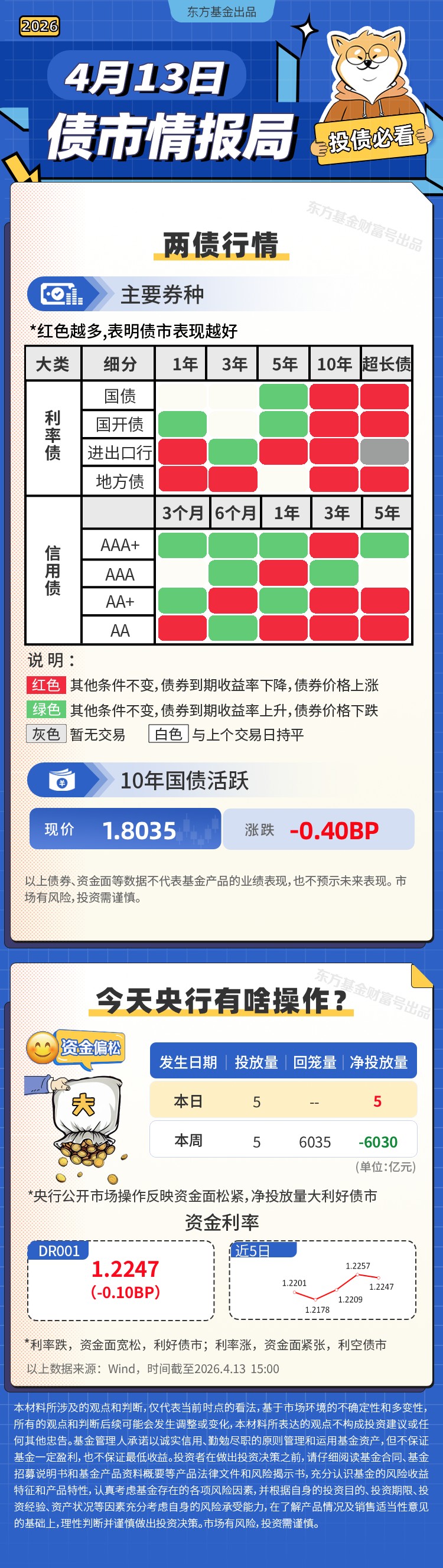【行情】今日利率债晴天。10年国债活跃券收益率下行0.4BP。信用债多云,银行债、城投债多数下跌;