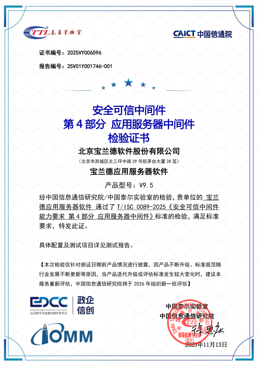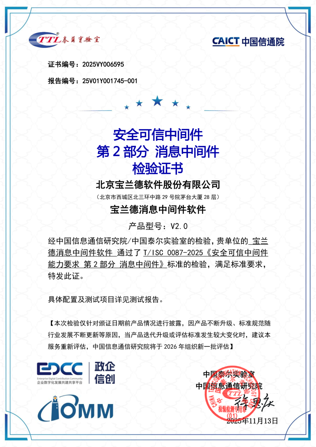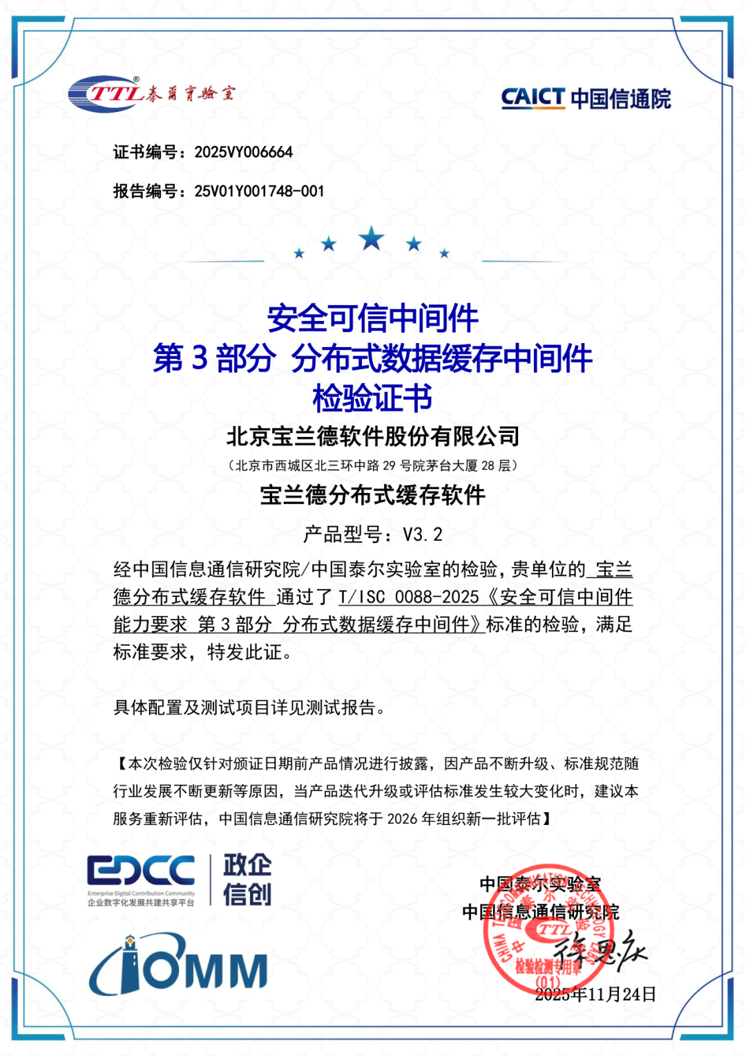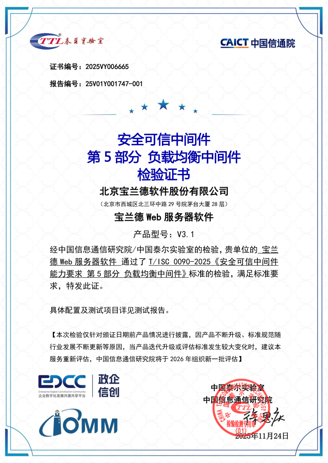 宝兰德核心产品线,包括消息中间件(BES MQ)、负载均衡中间件(BES WebServer)、分布式数据缓存中间件(BES CacheServer)以及应用服务器中间件(BES Application Server)全部通过评估,荣获“安全可信中间件”认证。这一“大满贯”式的成果,再次彰显了中国信通院对宝兰德产品技术实力与安全可靠性的高度认可。