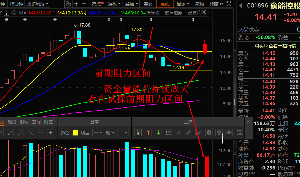 河南省火电龙头,控股/权益装机省内居前,600MW 级高效超临界机组占比超 80%,机组效率、环保水平领先。环渤海煤价同比降165 元/ 吨,长协保供稳定;河南容量电价、现货结算上调,直接增厚火电利润。周二早盘可能惯性冲高,存在试探 14.7—14.8元压力的可能,冲高后或遇部分短线获利盘兑现,若温和回踩支撑仍或是上涨途中的震荡整固。