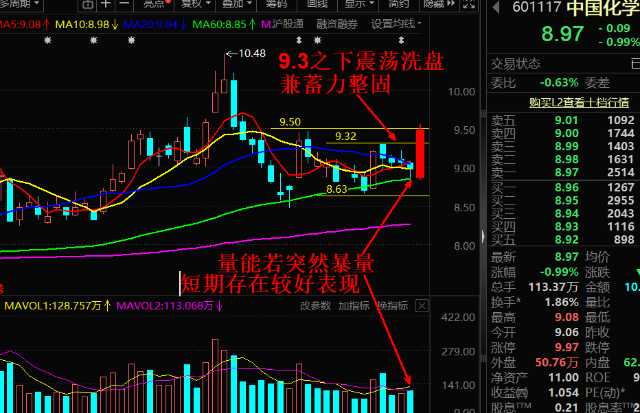 国内化学工程龙头,订单与业绩双保障:在手订单 4528 亿(收入比 2.3 倍),海外 / 新能源订单高增,业绩高增锁定。实业业务拐点:己二腈/气凝胶等卡脖子技术突破,2026-2027 年迎盈利爆发期。周二盘面可能8.9~9.05 元区间小幅波动,抛压会比较轻,毕竟昨天缩量回调,市场惜筹情绪较浓,存在探底后小幅回升的可能。