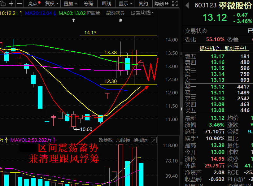 结合13日缩量洗盘,叠加AI算力板块周末整体偏暖的氛围,周二存在延续窄幅震荡、区间整固的走势,整体以稳为主、蓄力待变。