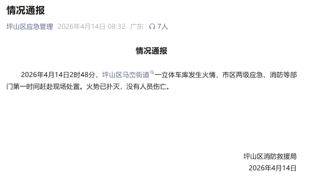 4月14日,“坪山区应急管理”微信公众号发布情况通报称,2026年4月14日2时48分,坪山区马峦街道一立体车库发生火情,市区两级应急、消防等部门第一时间赶赴现场处置。火势已扑灭,没有人员伤亡。