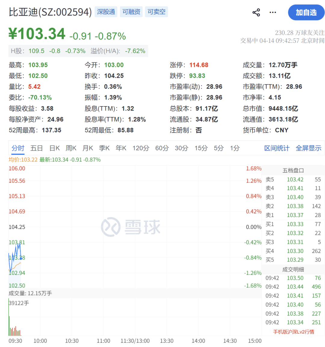 4月14日,比亚迪A股盘初跌超1%。截至发稿,比亚迪A股报103.34元/股,跌幅有所收窄。
