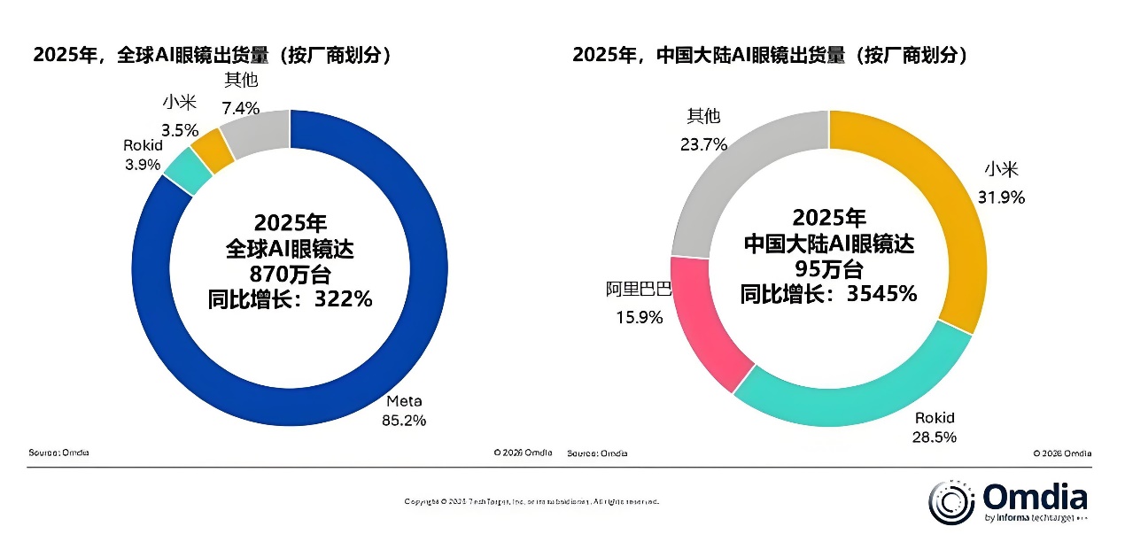 市场潜力: 根据Omdia数据,2025 年全球 AI 眼镜出货量同比增长 322%;中国是 2025 年全球同比增速最快的市场,且据 IDC 预测,2024–2029 年中国市场复合增长率将位居全球首位。