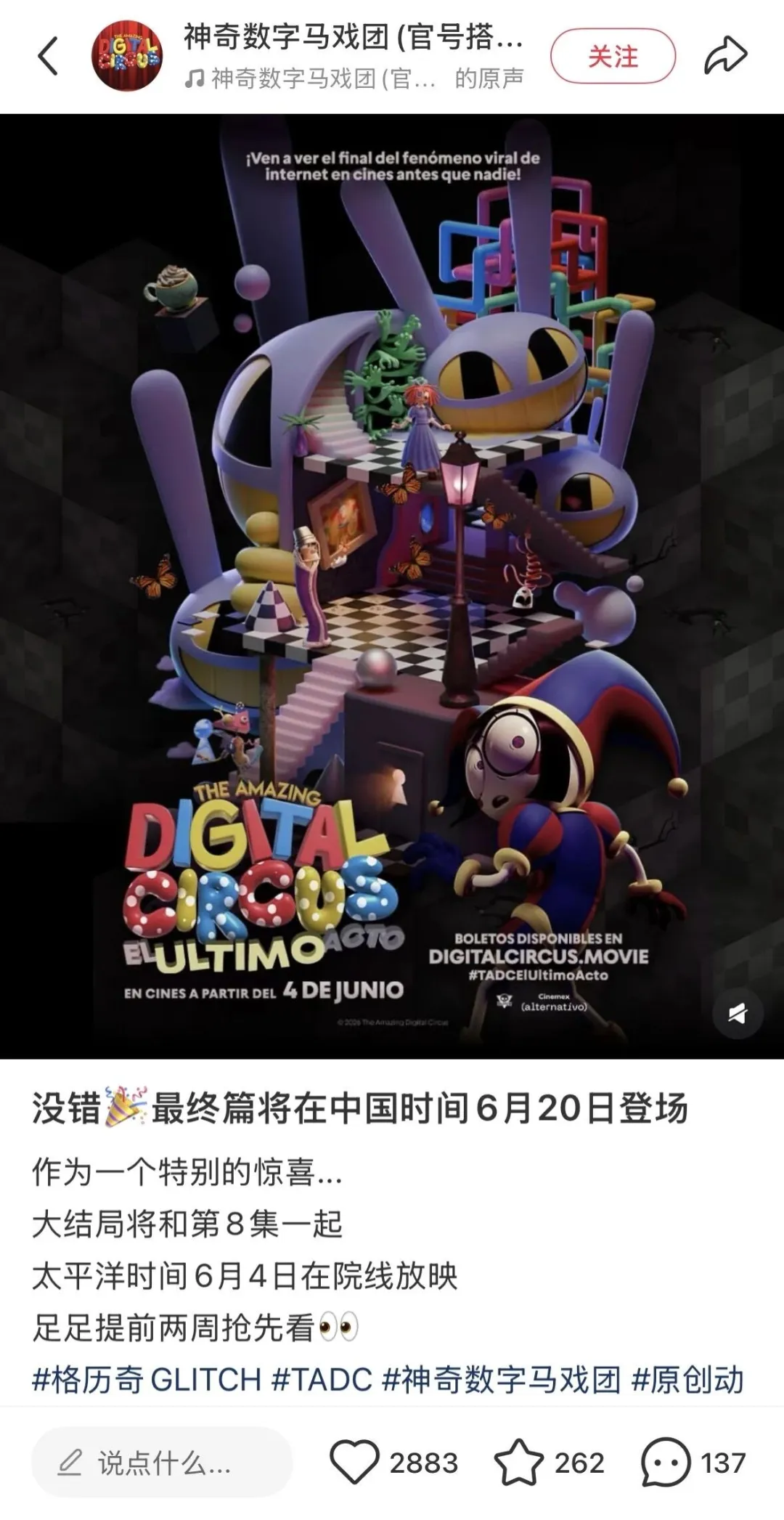 院线特别放映版《The Amazing Digital Circus: The Last Act》也将于今年6月登陆电影院。合作方为Fathom Entertainment。