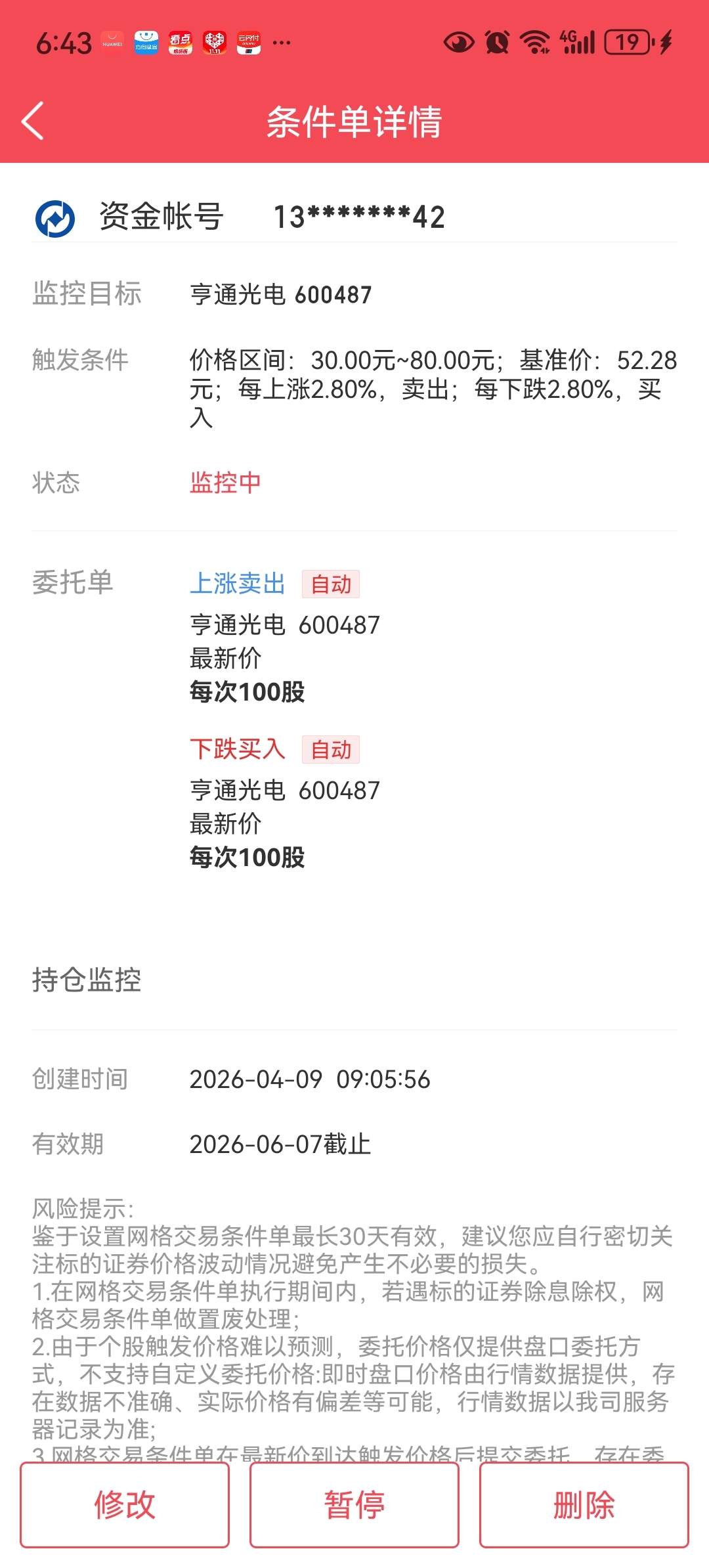 我已经算好了每一步,设置好了网格条件单:从现价52.67元开始,每下跌2.8%,就自动买入1手。哪怕股价还要往下走,我也会按着计划一步步补仓,绝不退缩。