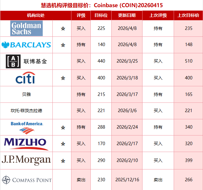 巴克莱银行分析师Benjamin Budish在2026年4月8日发布报告,将Coinbase的评级从“同等权重”下调至“低配”(减持),并将其目标价从148美元下调至140美元。这一调整反映了该行对Coinbase短期基本面恶化和缺乏估值支撑的强烈担忧。