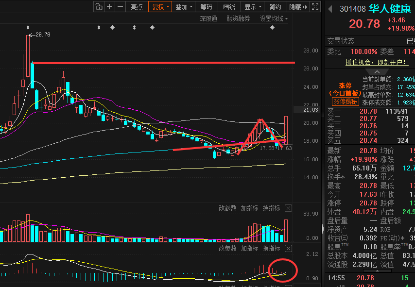 技术上,股价年初在见到高点后,股价单边弱势下行近3个股,随后地量在120日均线附近企稳,这也就为内盘已经被清洗的非常干净。4月初,市场因担心外围局势继续恶化,医药板块的防御属性被市场追捧,华人健康也出现明显放量大阳企稳反弹,连续三天振幅在10%左右,意味股性非常活跃。随后连续五天缩量全部回调下来再次来到120日均线支撑,但K线明显缩小下来。昨日在消息刺激下,股价稳步震荡走高,最终下午封住涨停,给到倍量大涨阳线反包。那么现在看来,前面的上行和调整会有偏大概率是在吸筹和洗盘。昨日的大阳线可视为短周期的主升浪开始信号。短期目标可放在26附近。