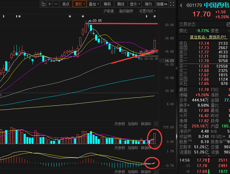当然,昨日整体表现非常强势,在大盘跟随创业板连续震荡回落的情况下,股价还多次给到冲击涨停,并一直维持在分时价格均线上方,这也就为昨日盘中市场看空动能偏弱。如此在短中期均线多头上移支撑下,只要量能稳定,继续保持稳步走高概率会偏大。昨日是电网设备启动的第一天,短期在市场热度有所回升的情况下,继续走高概率会偏大。短期目标可放在前高20附近。