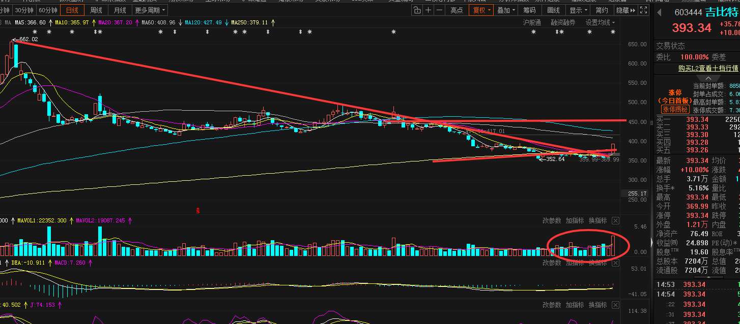 技术上,股价在去年9月见到高点后,已经连续弱势回调近7个月,近期股价在年线位置得到企稳,调整时间偏长,且量能也已经来到地量,这也就意味内盘的浮动筹码被大幅清洗。近期一个月的横盘震荡过程中,多次出现放量吸筹和缩量调整,有洗盘和洗盘迹象,昨日高开后,股价立即给到放量上攻,并直线封板,抢筹意图非常强劲。一般底部给到倍量涨停,会是偏强的看涨信号。如会小幅高开或调整,给到的容错率会偏大。短期目标客放在450附近。