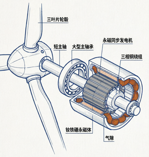 该技术路线取消了增速齿轮箱,由风轮直接驱动永磁发电机,结构简单,传动链短,理论上可靠性更高,运维成本更低。同时,它采用全功率变流器,电网友好性更佳,尤其适合电网基础薄弱的地区 。其缺点在于永磁发电机体积大、重量重,且对稀土永磁材料依赖度高,成本受稀土价格影响较大。金风科技是中国乃至全球永磁直驱路线的坚定推动者和市场领导者 。