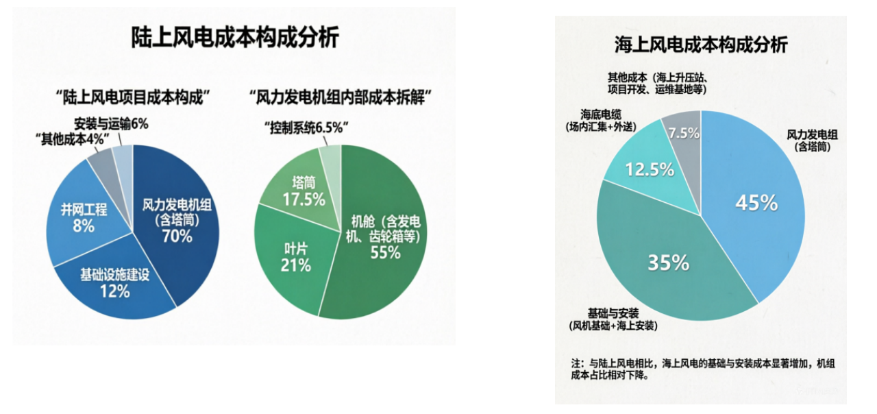 一个完整的风电项目投资,可大致分为设备成本和工程建设及其他成本(Balance of Plant, BOP)。不同来源的数据因统计口径、项目类型(陆上/海上)和地区差异而有所不同,但核心构成是清晰的。