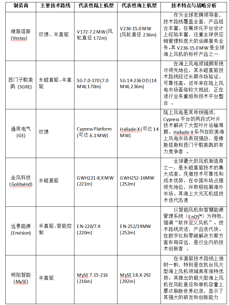 全球风电整机制造市场由少数几家巨头主导,它们的技术路线和产品布局各有侧重。