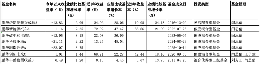 根据Wind数据,截至4月10日,闫思倩掌舵的鹏华碳中和主题A、鹏华沪港深新兴成长A、鹏华科技驱动A、鹏华制造升级A(成立于2025年10月14日)等4只基金今年以来净值跌幅超过10%,分别为-12.95%、-13.83%、-21.11%、-22.07。