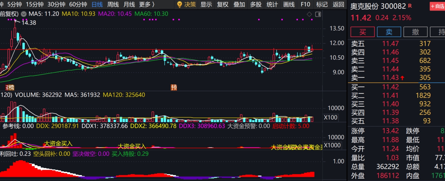 $奥克股份(SZ300082)$ 奥克股份 (300082) —— 弹性最大,适合博弈· 核心逻辑:新能源转型(储能+锂电)是当前市场认可度较高的短期题材。· 技术走势:近6个月涨41%,近期明显强于大盘且放量,说明有资金在运作。虽短线有回调,但未破关键支撑。· 短期催化剂:二氧化碳储能技术若有利好消息(合作落地、政策支持),很容易脉冲式拉升。· 操作思路:适合回调低吸,设好止损(比如-7%),搏题材轮动。· 风险:基本面仍亏损,波动大,不适合无纪律持有。。