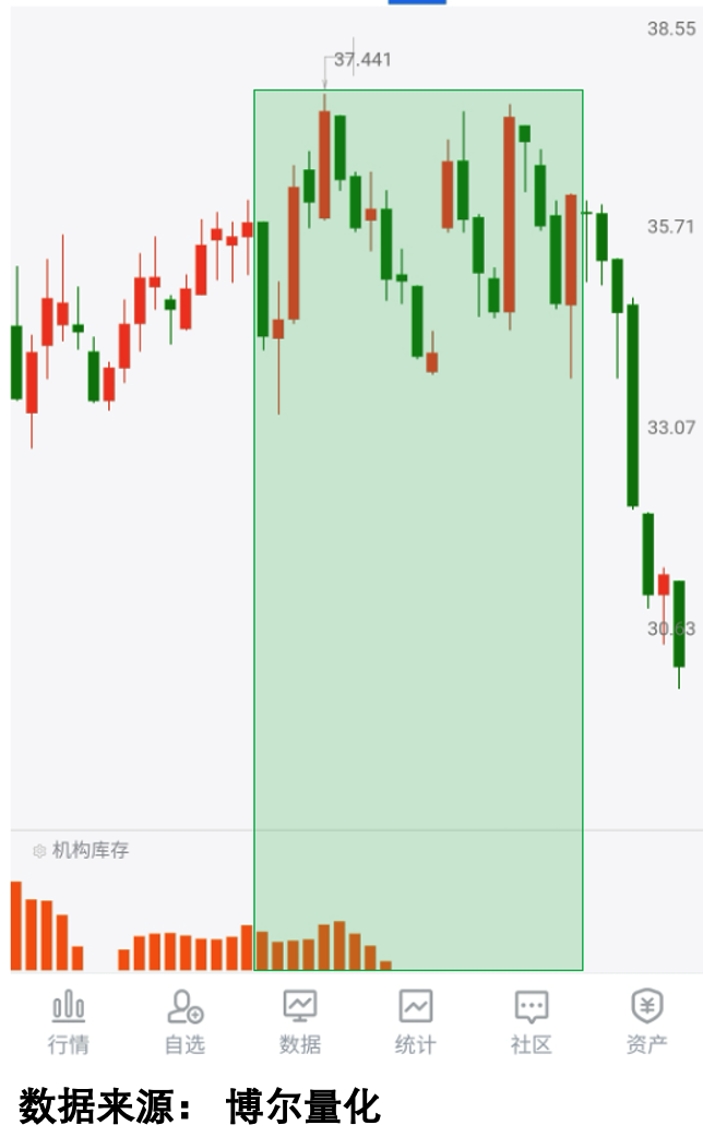还有人会觉得这是不是巧合,我们再看另一只震荡幅度更大的个股,宽幅震荡的过程中时不时有大阳线拉起来,看起来走势很强,很容易让人觉得已经企稳,结果后面突然出现大幅调整,想反应都来不及。其实用量化数据看,在震荡的过程中,「机构库存」数据已经在慢慢减少,到后面直接消失了,说明大资金的参与意愿越来越低,就算偶尔有大阳线,也很难持续。 看图3:
