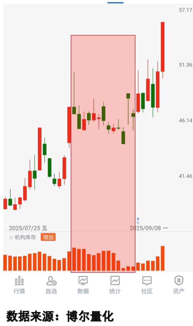 很多人选标的的时候,总喜欢盯着是不是热点、有没有业绩、价格够不够低这几个标准,但实际用起来就会发现,这些标准有时候根本不准,就像之前看到的行情,有些业绩增速很高的板块走势一般,反而有些全行业暂时亏损的板块表现更好。这是因为业绩、走势这些都是表面现象,真正影响市场走向的,是大资金的交易行为。我用了十多年的量化大数据工具里,有个很基础的指标叫「机构库存」,大家可以把它理解成给市场做体检时的活力指标,它不告诉你大资金买了什么还是卖了什么,也和资金流入流出没有关系,只是客观反映大资金有没有在积极参与交易,柱状线越明显,说明大资金的交易意愿越强,参与的时间也越久。 比如下面这只个股,连续四连阴之后进入横盘整理,看起来像是跌到位了要企稳,结果后面又继续走弱。用量化数据看就很清楚,横盘阶段「机构库存」数据只出现了很短时间就消失了,说明大资金参与交易的意愿很低,自然很难有好的表现。 看图1: