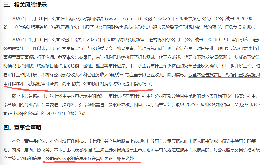 刚又打了个电话,本想确认一个事,按以前年度会计师事务所最晚会在业绩公告发布前5个交易日提交审计报告给上市公司,但由于目前营收确认的问题有可能会晚于这个时间节点,但目前公司还是按30号业绩披露在展开工作,目前从字面上能明确的就是,目前在审的营收肯定是在3亿以上,不然直接发退市公告了,其次这个3亿+有点险,所以发了个尚不能确认!反正我能了解的所有情况就这些了,立信也打电话过去了,报表是按上市公司要求的时间准时上报,如果延时会有公告,那也就是直接退了,目前看不至于,现在就是少数营收确认,在等上市公司补充资料了(讲一句题外话,为了保壳造也得给我造出来)!