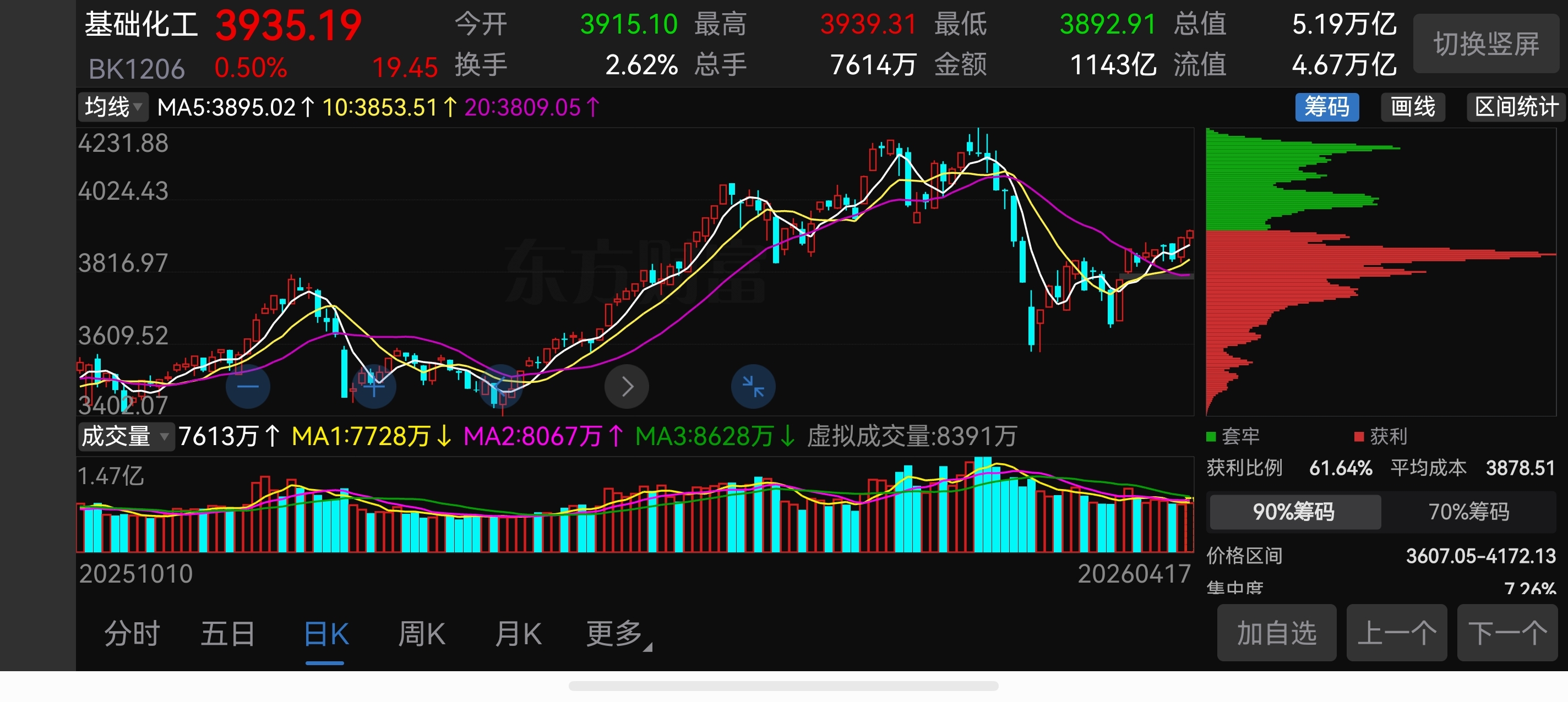 化工板块近期走势还算健康,走出了教科书级的趋势行情,尤其是精细化工、新能源化工材料、顺周期涨价品种全线跟涨,前排龙头继续打高度,中位股扩空间,后排细分持续补涨,梯队完整度拉满,完全不是一日游行情,主力抱团的意图非常明确。从筹码结构看,目前筹码底部比较夯实,3870附近形成了筹码密集峰,每年4月份都是炒作化工涨价周期,今年因为Ai硬件先动,所以化工板块迟迟还没有启动,但并不影响后续行情。