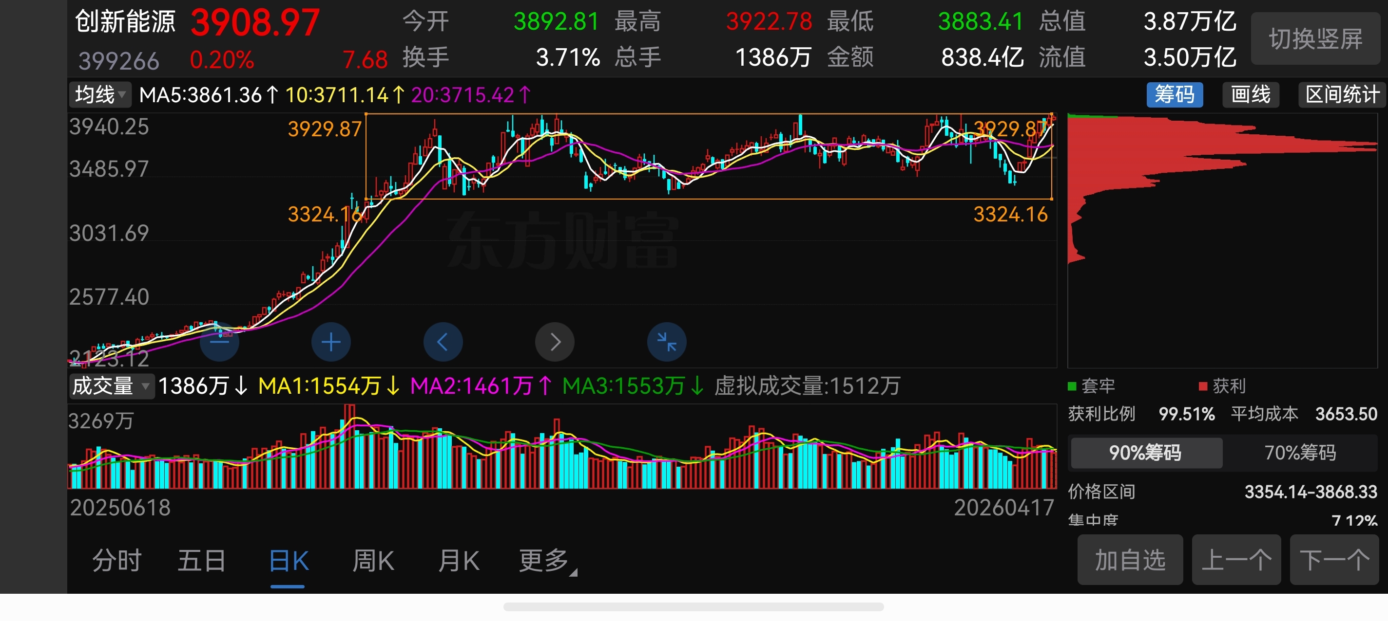 新能源板块也是近期比较活跃的赛道,只要宁王分时均线不有效跌破,整个板块就有持续上攻的动力。持仓的兄弟,咱们之前锁定的锂电龙头、能源金属核心标,继续拿稳,趋势没坏就别乱动;没跟上的兄弟,别追高宁王,重点找产业链里深度绑定宁王、一季报业绩超预期的上游材料、储能核心标。从创新能源板块指数看,目前指数即将突破箱体,一旦形成有效突破,板块就可能迎来一波中长线行情。
