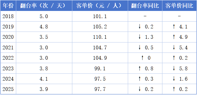 海底捞2018年—2025年翻台率与客单价(官方财报口径)