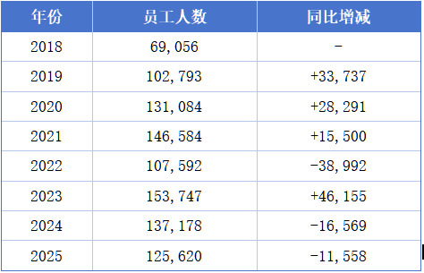 面对业绩下滑,海底捞不得不节流。数据显示,近年来,海底捞员工持续下滑。仅2025年,海底捞员工数量就减少了1.1万人。