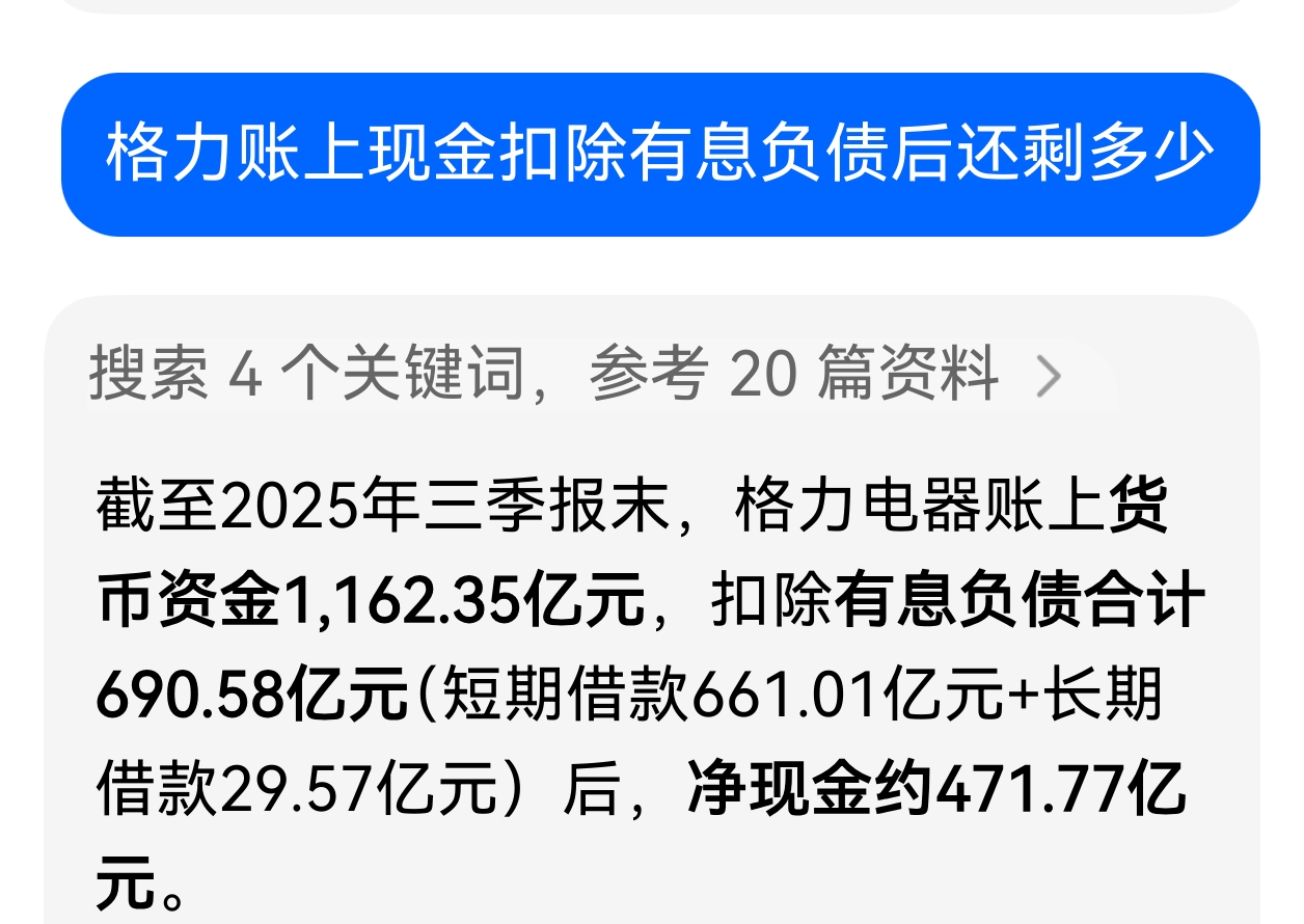 格力到底有多少现金?一些格里芬说账上有一千多亿!问题是只算资产不算负债的吗?确实格力有一千亿出头的现金但格力有息负债也就是借款有690亿!真正属于格力的现金最多4百多亿。