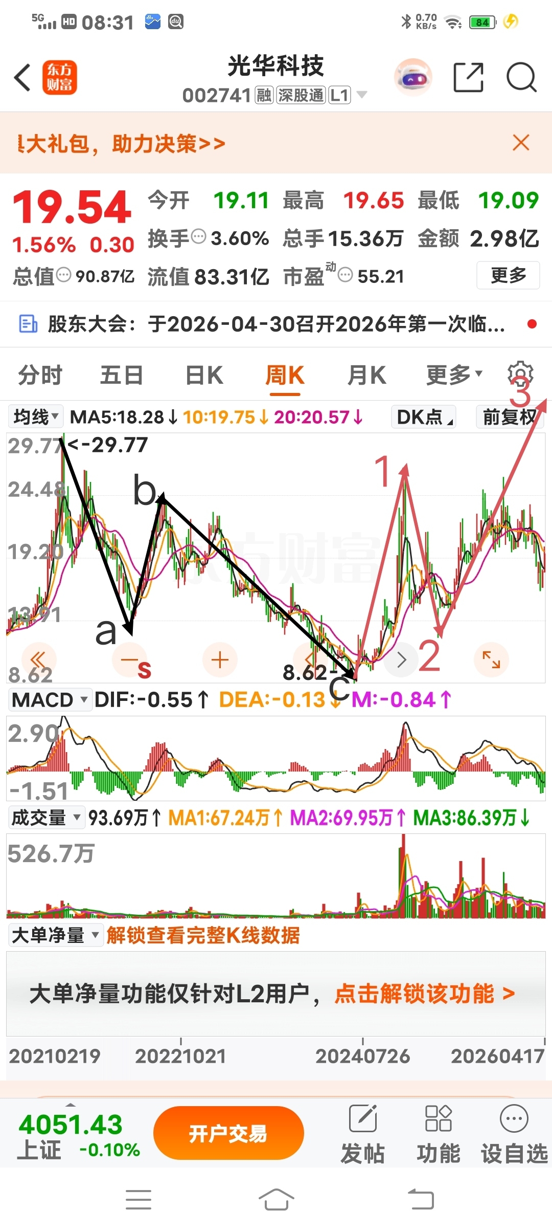 二、走势浪型分析(前复权图形观察)股价从29.77元高点下跌,呈a浪下跌、b浪反弹、c浪下跌走势,2024.06.26见低点8.62元,之后股价不再下跌,而是反转向上运行1浪上升,2024.12.10见高点26.82元,涨幅211%,随后运行2浪下跌,2025.04.09见低点12.47元,接着运行3浪上升至今。