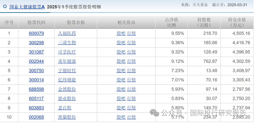 2025年一季度末,国泰大健康股票持仓前十大个股中,依然可以看到宁德时代、亿纬锂能、金博股份、德业股份这些新能源个股,四只个股合计比例达26%。与更新修订后的基金合同中的投资约定依然是格格不入。