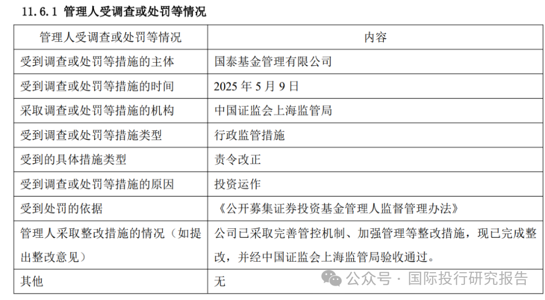 翻阅国泰基金旗下基金产品2025年年度定期报告,报告中显示,2025年5月,国泰基金被中国证监会上海监管局处以行政处罚,责令其改正,受到处罚的原因是投资运作,公司表示,已采取完善管控机制、加强管理等整改措施,完成了整改。
